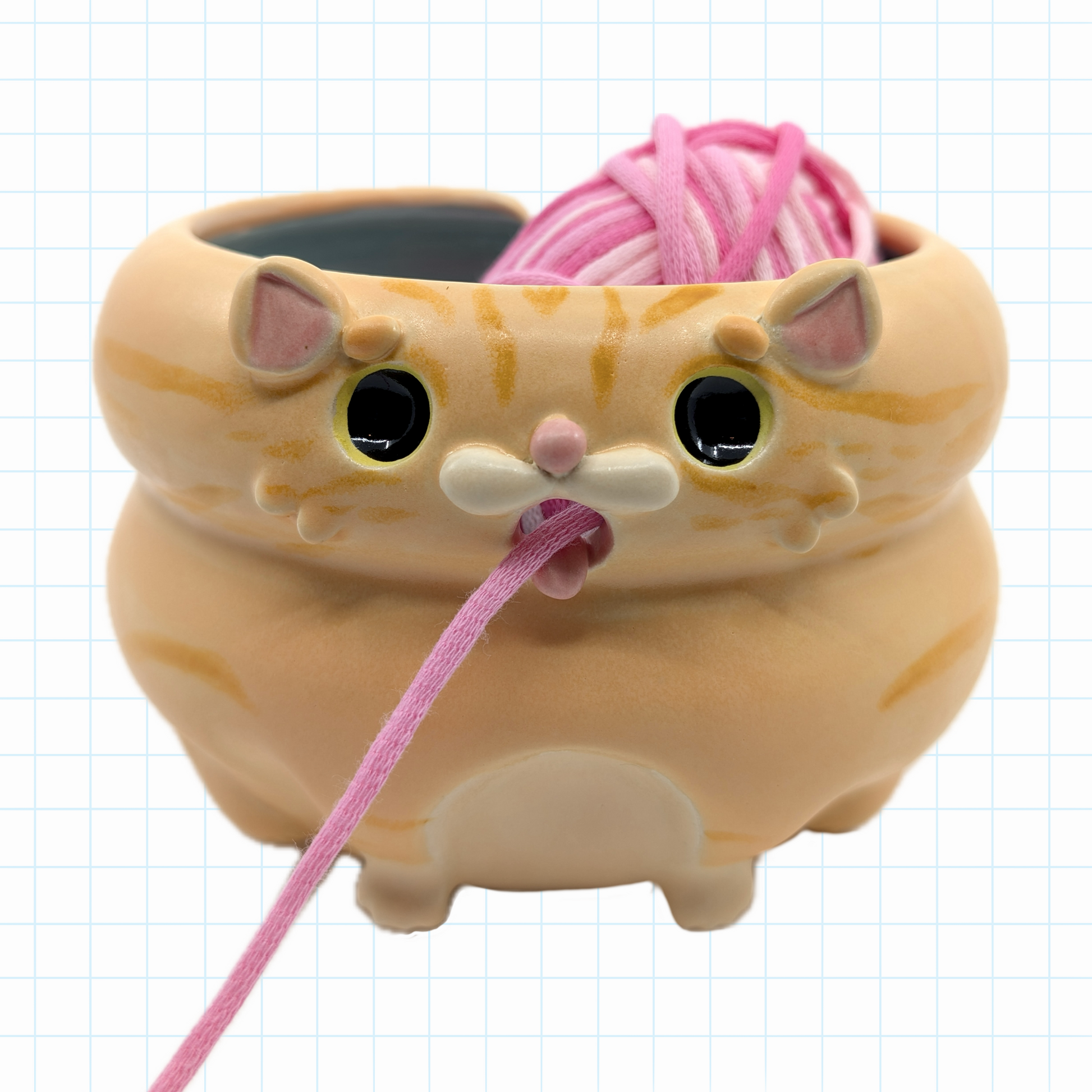 Silly handmade ceramic yarn bowl of a hefty cat to keep you company while you're crocheting <3 You can thread the yarn through its mouth or butt (lol) but have the option of an open back if that's what you prefer!