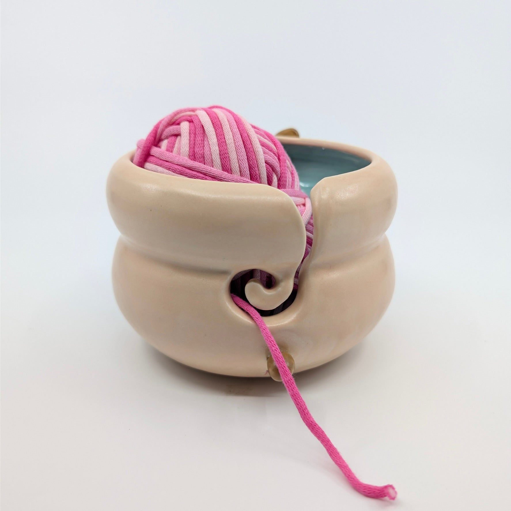 Silly handmade ceramic yarn bowl of a hefty cat to keep you company while you're crocheting <3 You can thread the yarn through its mouth or butt (lol) but have the option of an open back if that's what you prefer!